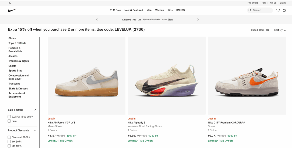 If you’ve been waiting for the perfect time to score your favorite Nike shoes and running gear — this is it. The Nike PH 11.11 Sale is live from November 3–11, 2025, offering up to 60% off on top styles including the Nike Air Force 1, Vaporfly 4, Alphafly 3, Air Max 90, and Air Jordan 1. No promo code is required for these markdowns, but if you want to level up your savings, you can use the extra 15% off promo code: LEVELUP when you buy two or more sale items.
